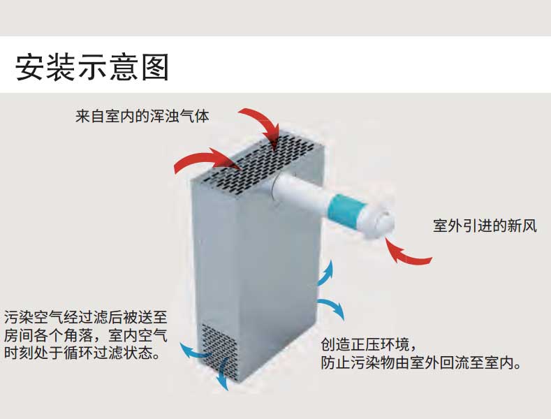 主要組成:排風(fēng)口新風(fēng)主機、進排風(fēng)口、風(fēng)管、過濾系統(tǒng)